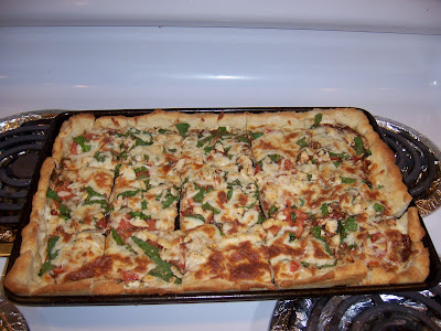 i had a pantry that was lookin' slim (that seems to be a theme lately, huh?). so i dug around to see what i could round up. luckily, i had two packets of pizza dough mix hidden in the pack of a cupboard. i made the crust according to the package and pressed it into a shallow cookie sheet and baked it for 10 to 15 minutes. just enough to puff it up and prevent it from getting soggy from the sauce.